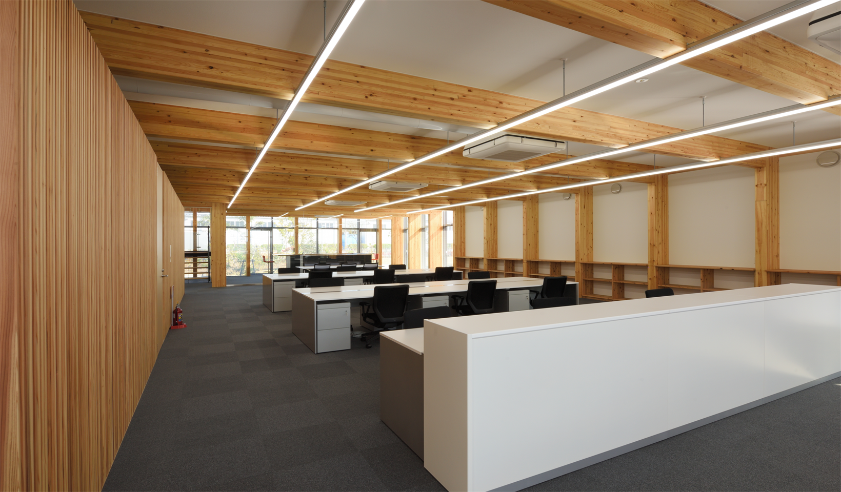 事務所のメイン通路にはアクセントとして、富山県産スギを使用した格子壁を設置。反対側の壁には書類棚を県産スギで製作。