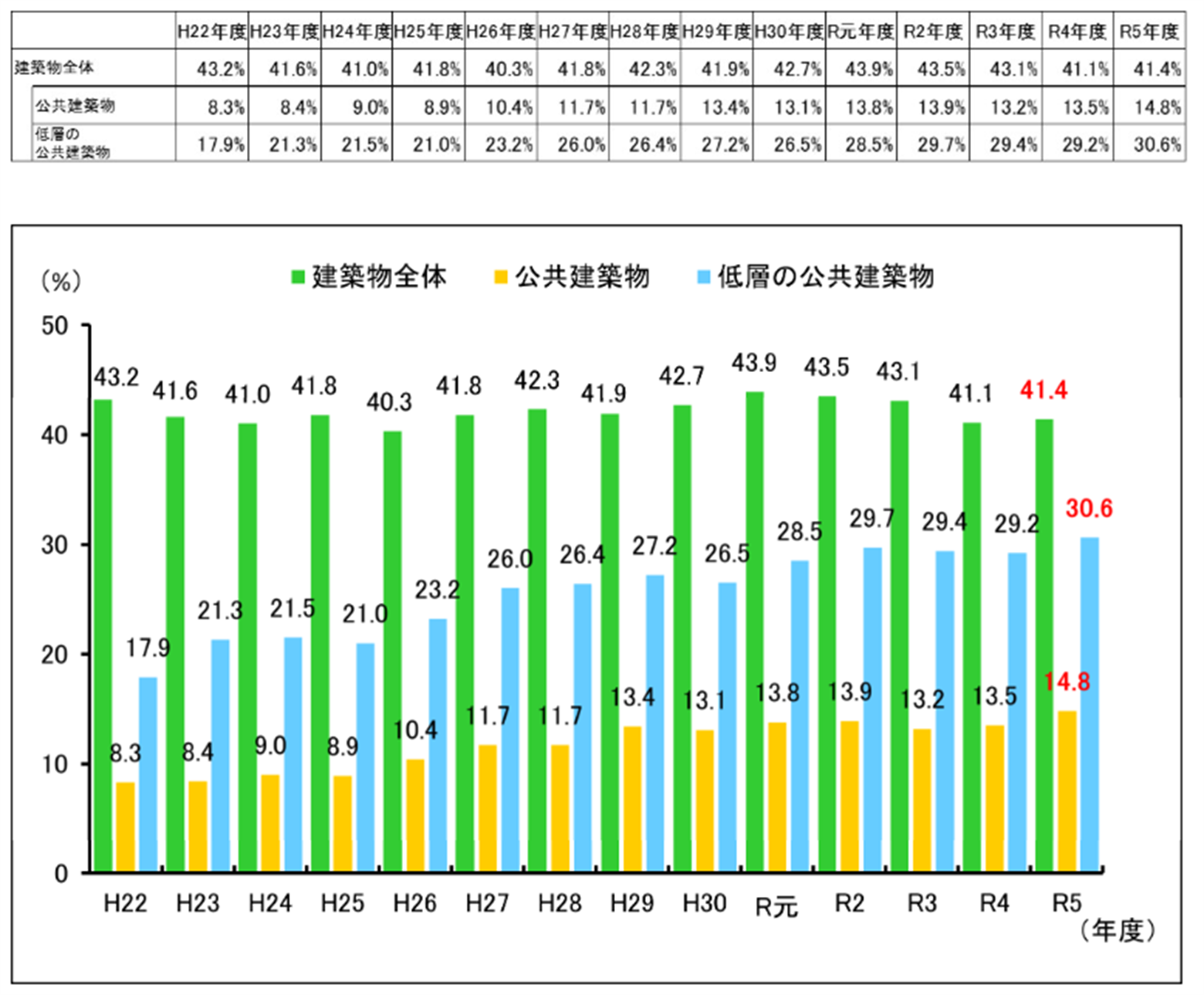 その結果、3階建て以下の公共建築物の木造化率は、平成22年の17.9%から令和5年には30.6%へと上昇しています【林野庁試算】。