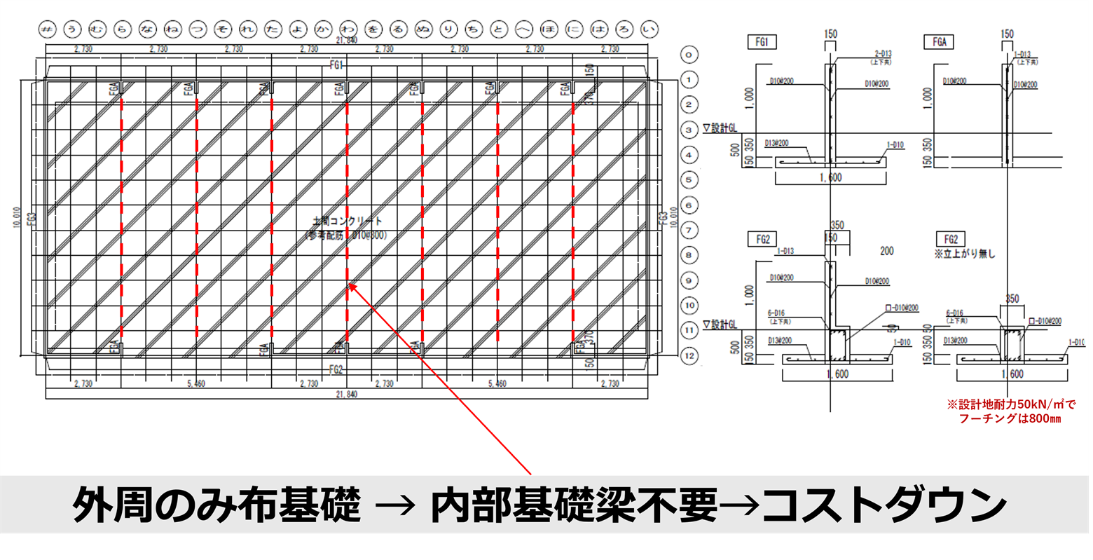 - 基礎断面(梁成・幅)の縮小による生コン・鉄筋コストの抑制